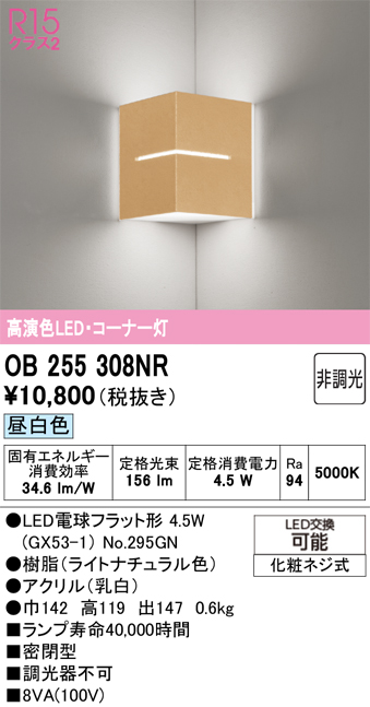 オーデリック OB255308NR(ランプ別梱) ブラケットライト コーナー灯 非調光 LEDランプ 昼白色 ナチュラル [ob255308nr]