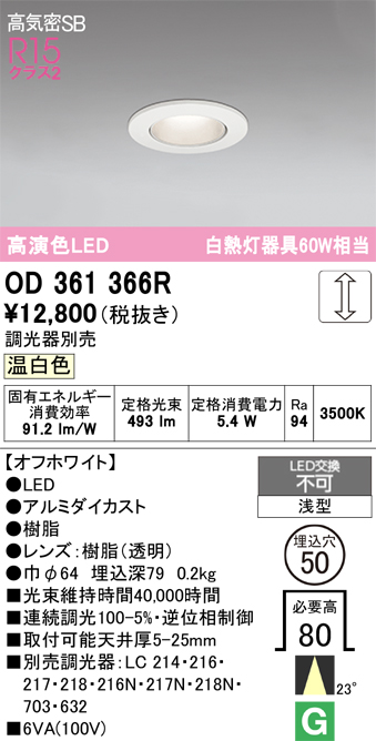オーデリック OD361366R ダウンライト φ50 調光 調光器別売 LED一体型 温白色 浅型 オフホワイト [od361366r]