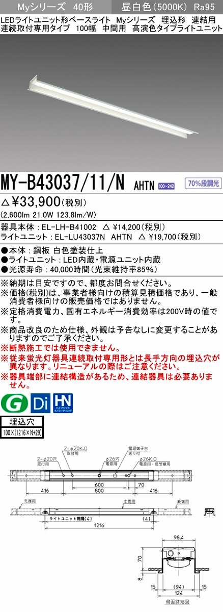 三菱 MY-B43037/11/N AHTN LEDライトユニット形ベースライト 埋込形 連結用 連続取付専用 中間用 昼白色 電源ユニット内蔵 受注生産品 [§]