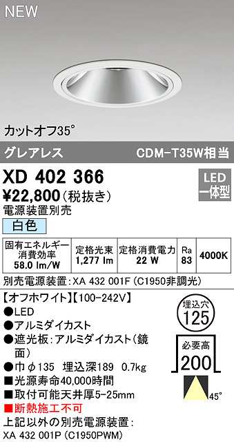 オーデリック XD402366 ダウンライト φ125 電源装置別売 LED一体型 白色 グレアレス オフホワイト