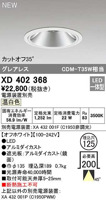 オーデリック XD402368 ダウンライト φ125 電源装置別売 LED一体型 温白色 グレアレス オフホワイト [xd402368]