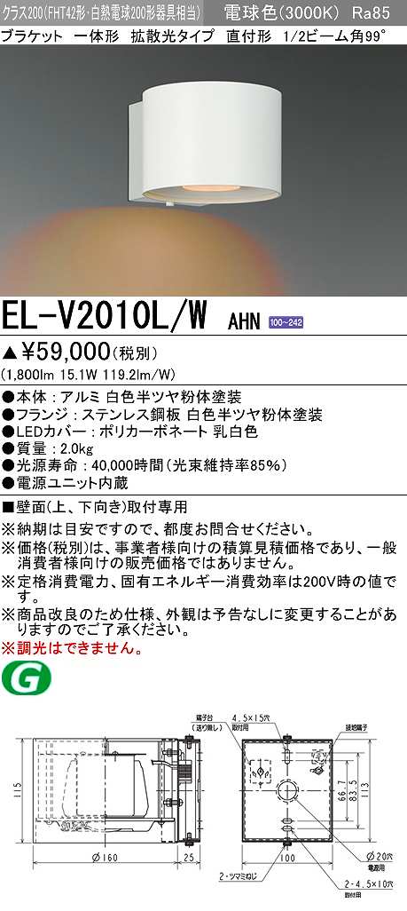 三菱 EL-V2010L/WAHN ブラケットライト 直付形 壁面取付専用 拡散光タイプ 固定出力 電球色 ホワイト 受注品 [§] [el-v2010l-wahn]