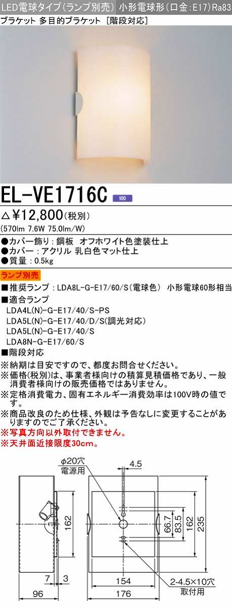 三菱 EL-VE1716C ブラケットライト LED電球タイプ (ランプ別売) 壁面取付専用 階段対応 受注生産品 [§]