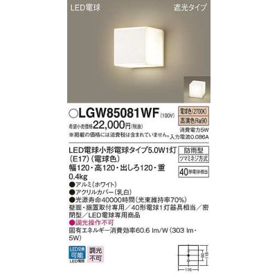パナソニック LGW85081WF ポーチライト ランプ同梱 LED(電球色) 壁直付型 据置取付型 遮光タイプ 密閉型 電球交換型 防雨型 ホワイト