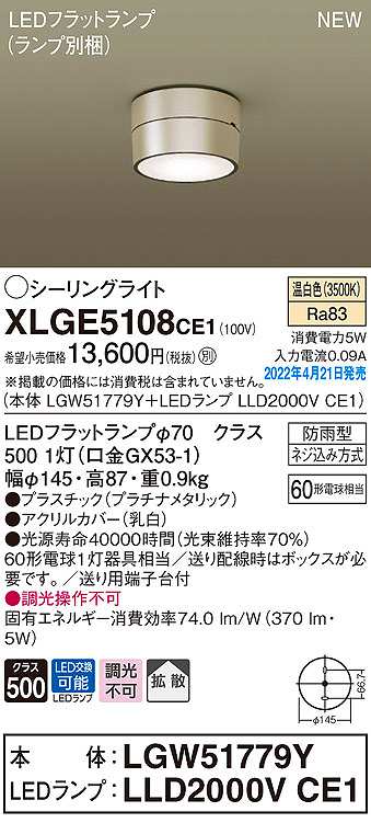 パナソニック XLGE5108CE1(ランプ別梱) シーリングライト LED(温白色) 拡散 LEDフラットランプ交換型 防雨型 プラチナメタリック [xlge5108ce1]