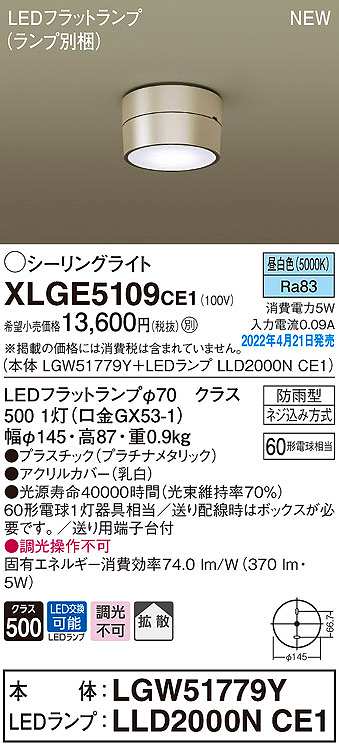 パナソニック XLGE5109CE1(ランプ別梱) シーリングライト LED(昼白色) 拡散 LEDフラットランプ交換型 防雨型 プラチナメタリック [xlge5109ce1]