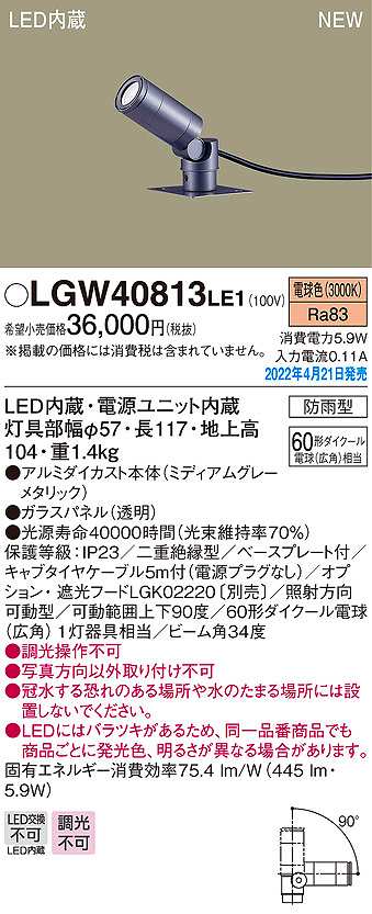 パナソニック LGW40813LE1 エクステリア スポットライト LED(電球色) 据置取付型 ビーム角34度 防雨型 ミディアムグレーメタリック