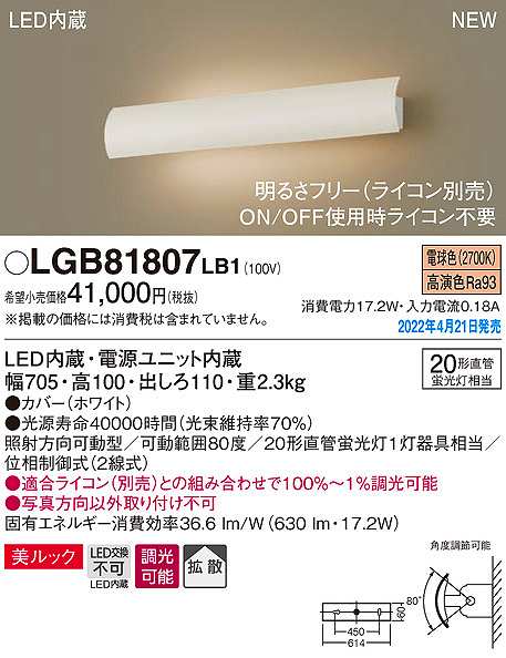 パナソニック LGB81807LB1 ユニバーサルブラケット 調光(ライコン別売) LED(電球色) 壁直付型 美ルック 拡散 照射方向可動型 ホワイト [lgb81807lb1]