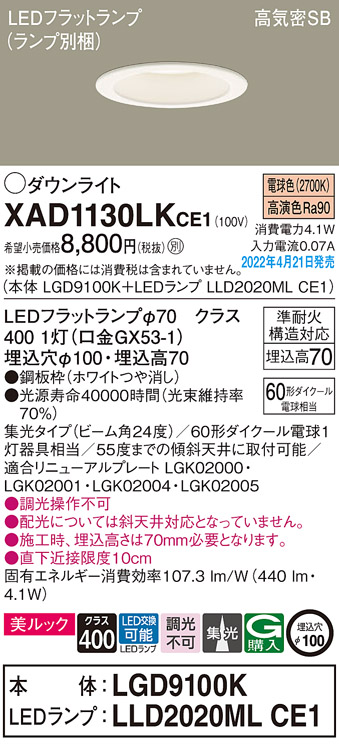 パナソニック XAD1130LKCE1(ランプ別梱) ダウンライト 埋込穴φ100 LED(電球色) 天井埋込型 美ルック 高気密SB形 ホワイト [xad1130lkce1]