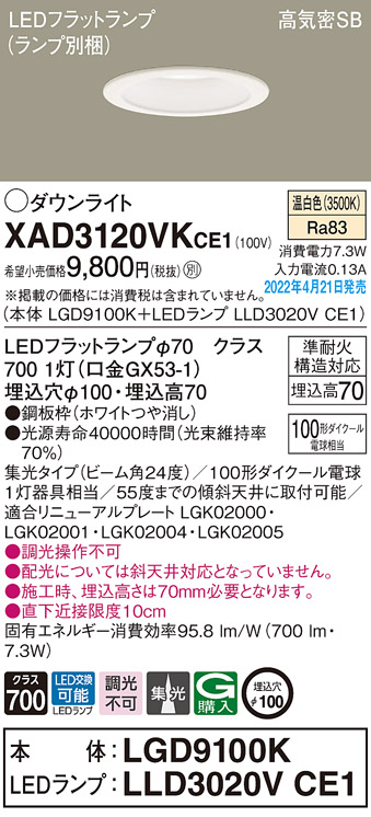 パナソニック XAD3120VKCE1(ランプ別梱) ダウンライト 埋込穴φ100 LED(温白色) 天井埋込型 高気密SB形 ホワイト [xad3120vkce1]