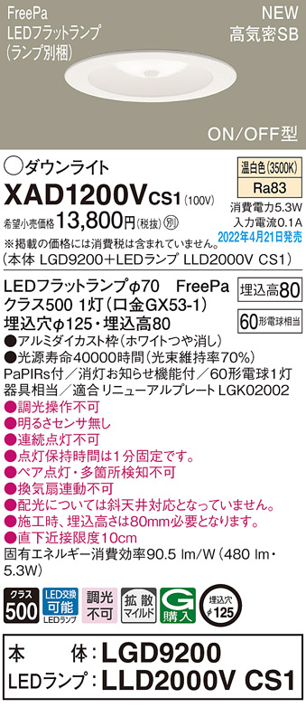 パナソニック XAD1200VCS1(ランプ別梱) ダウンライト 埋込穴φ125 LED(温白色) 天井埋込型 浅型8H 高気密SB形 ホワイト