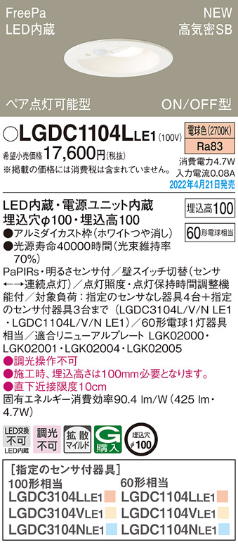 パナソニック LGDC1104LLE1 ダウンライト 埋込穴φ100 LED(電球色) 天井埋込型 高気密SB形 明るさセンサ付 ホワイト