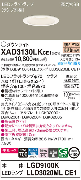 パナソニック XAD3130LKCE1(ランプ別梱) ダウンライト 埋込穴φ100 LED(電球色) 天井埋込型 美ルック 高気密SB形 ホワイト