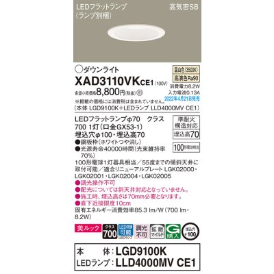 パナソニック XAD3110VKCE1(ランプ別梱) ダウンライト 埋込穴φ100 LED(温白色) 天井埋込型 美ルック 高気密SB形 ホワイト [xad3110vkce1]