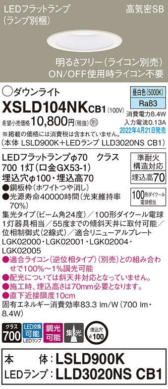 パナソニック XSLD104NKCB1(ランプ別梱) ダウンライト 埋込穴φ100 調光(ライコン別売) LED(昼白色) 天井埋込型 高気密SB形 ホワイト