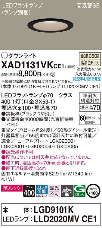 パナソニック XAD1131VKCE1(ランプ別梱) ダウンライト 埋込穴φ100 LED(温白色) 天井埋込型 美ルック 高気密SB形 ブラック [xad1131vkce1]