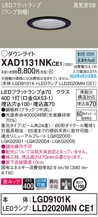 パナソニック XAD1131NKCE1(ランプ別梱) ダウンライト 埋込穴φ100 LED(昼白色) 天井埋込型 美ルック 高気密SB形 ブラック [xad1131nkce1]