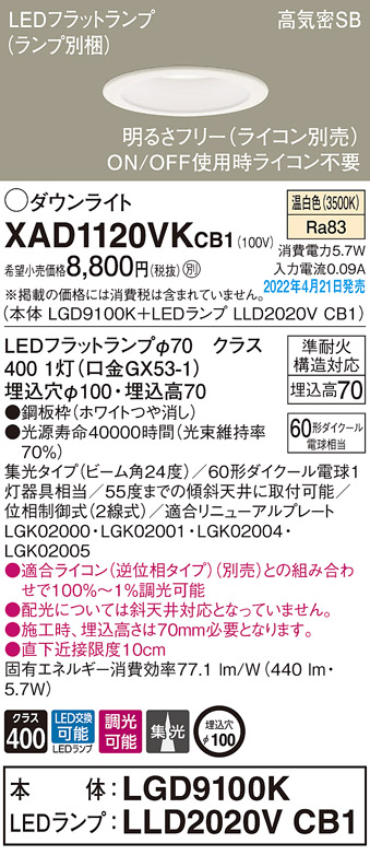 パナソニック XAD1120VKCB1(ランプ別梱) ダウンライト 埋込穴φ100 調光(ライコン別売) LED(温白色) 天井埋込型 高気密SB形 ホワイト
