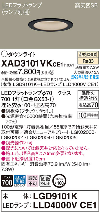 パナソニック XAD3101VKCE1(ランプ別梱) ダウンライト 埋込穴φ100 LED(温白色) 天井埋込型 高気密SB形 ブラック