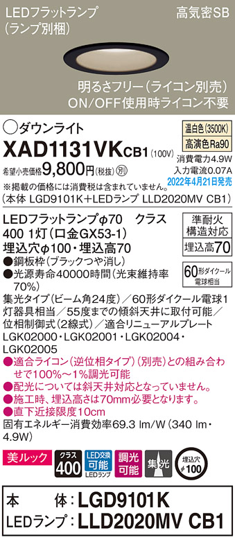 パナソニック XAD1131VKCB1(ランプ別梱) ダウンライト 埋込穴φ100 調光(ライコン別売) LED(温白色) 天井埋込型 美ルック 高気密SB形 ブラック