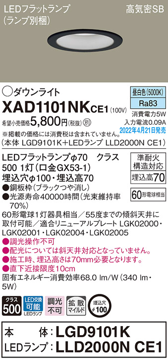 パナソニック XAD1101NKCE1(ランプ別梱) ダウンライト 埋込穴φ100 LED(昼白色) 天井埋込型 高気密SB形 ブラック
