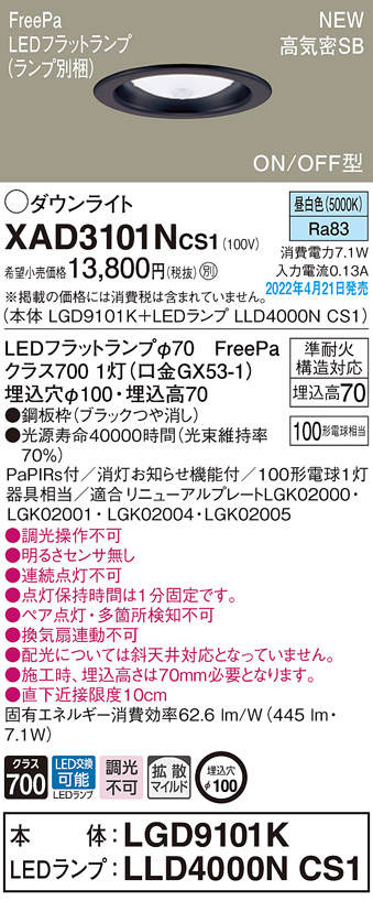 パナソニック XAD3101NCS1(ランプ別梱) ダウンライト 埋込穴φ100 LED(昼白色) 天井埋込型 高気密SB形 ブラック