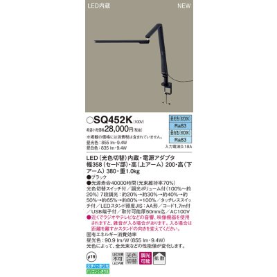 パナソニック SQ452K スタンドライト デスク取付型 LED(昼光色・昼白色) 拡散タイプ・タッチレススイッチ付 ブラック