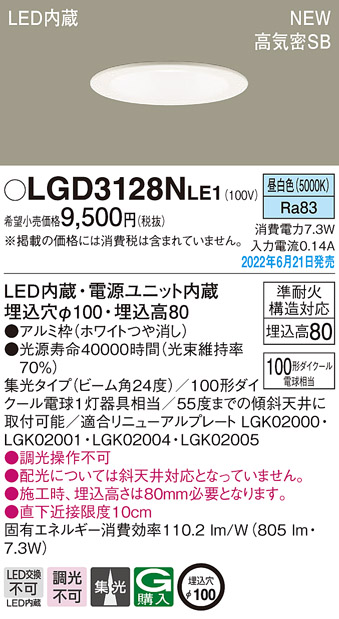 パナソニック LGD3128NLE1 ダウンライト 天井埋込型 LED(昼白色) 浅型8H・高気密SB形・ビーム角24度・集光タイプ 埋込穴φ100 ホワイト