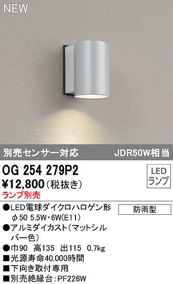 オーデリック OG254279P2 エクステリア ポーチライト ランプ別売 LEDランプ 別売センサー対応 防雨型 マットシルバー [og254279p2]