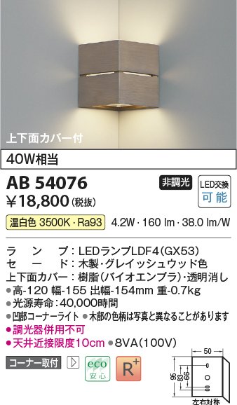 コイズミ照明 AB54080 ブラケットライト 非調光 LEDランプ 温白色 コーナー取付 上下面カバー付 ナチュラルウッド色 [ab54080]