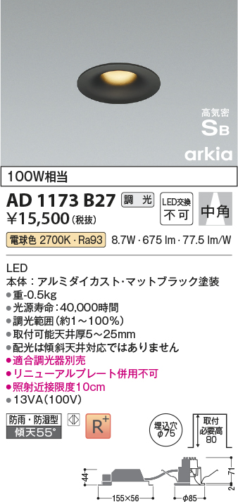 コイズミ照明 AD1173B27 ダウンライト 埋込穴φ75 調光 調光器別売 LED一体型 電球色 防雨・防湿型 高気密SB arkia マットブラック [ad1173b27]