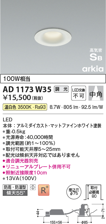 コイズミ照明 AD1173W35 ダウンライト 埋込穴φ75 調光 調光器別売 LED一体型 温白色 防雨・防湿型 高気密SB arkia マットファインホワイト