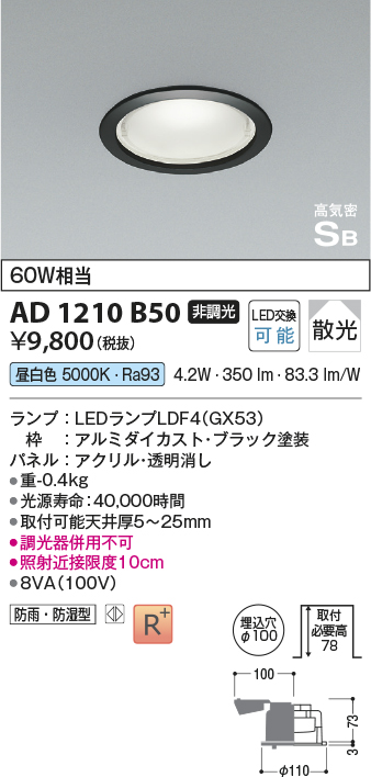 コイズミ照明 AD1210B50 ダウンライト 埋込穴φ100 非調光 LEDランプ 昼白色 防雨・防湿型 高気密SB ブラック [ad1210b50]
