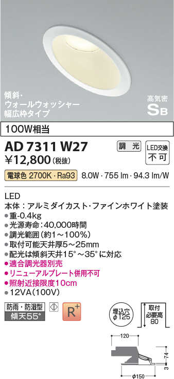 コイズミ照明 AD7311W27 ダウンライト 埋込穴φ125 調光 調光器別売 LED一体型 電球色 防雨・防湿型 高気密SB 傾斜 ウォールウォッシャー ファインホワイト