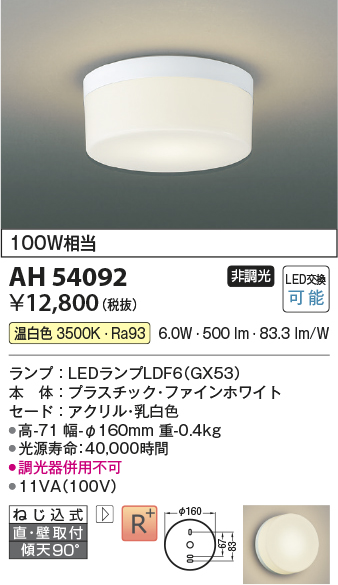 コイズミ照明 AH54092 シーリングライト 非調光 LEDランプ 温白色 直付・壁付取付 ファインホワイト [ah54092]