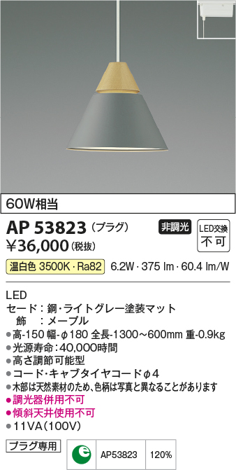 コイズミ照明 AP53823 ペンダント 非調光 LED一体型 温白色 プラグタイプ ライトグレー [ap53823]