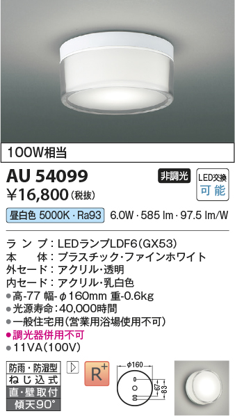 コイズミ照明 AU54099 アウトドアライト 非調光 LEDランプ 昼白色 防雨・防湿型 直付・壁付取付 ファインホワイト [au54099]