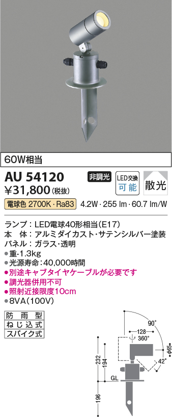 コイズミ照明 AU54120 アウトドアライト 非調光 LEDランプ 電球色 防雨型 サテンシルバー [au54120]