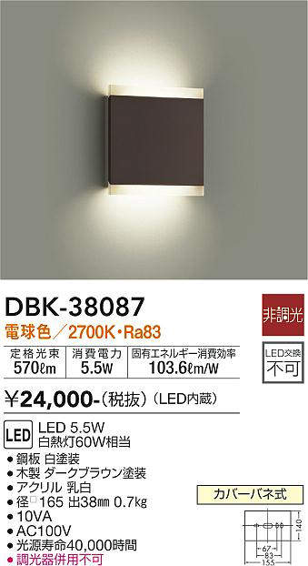 大光電機(DAIKO) DBK-38087 ブラケット LED内蔵 非調光 電球色 ダークブラウン [dbk-38087]