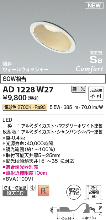 コイズミ照明 AD1228W27 ダウンライト 埋込穴φ100 調光 調光器別売 LED一体型 電球色 高気密SB形 傾斜・ウォールウォッシャー 防雨・防湿型 パウダリーホワイト [ad1228w27]