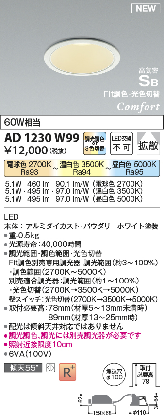 コイズミ照明 AD1230W99 ダウンライト 埋込穴φ100 Fit調色・光色切替 調光器別売 LED一体型 高気密SB形 ベース 拡散 パウダリーホワイト [ad1230w99]