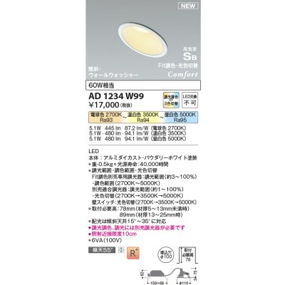 コイズミ照明 AD1234W99 ダウンライト 埋込穴φ100 Fit調色・光色切替 調光器別売 LED一体型 高気密SB形 傾斜・ウォールウォッシャー パウダリーホワイト [ad1234w99]