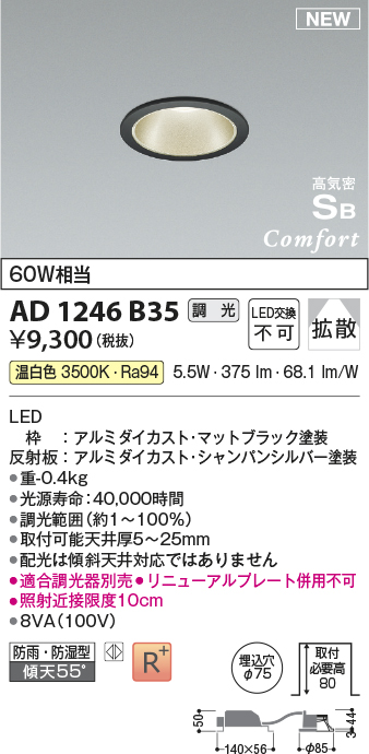 コイズミ照明 AD1246B35 ダウンライト 埋込穴φ75 調光 調光器別売 LED一体型 温白色 高気密SB形 ベース 拡散 防雨・防湿型 マットブラック [ad1246b35]