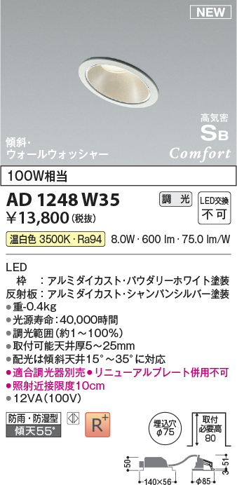 コイズミ照明 AD1248W35 ダウンライト 埋込穴φ75 調光 調光器別売 LED一体型 温白色 高気密SB形 傾斜・ウォールウォッシャー 防雨・防湿型 パウダリーホワイト