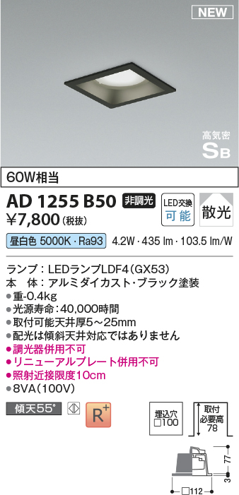 コイズミ照明 AD1255B50 ダウンライト 埋込穴□100 非調光 LED 昼白色 高気密SB形 ベース 散光 ブラック