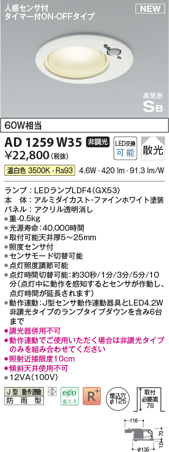 コイズミ照明 AD1259W35 ダウンライト 埋込穴φ125 非調光 LED 温白色 高気密SB形 ベース 散光 人感センサ付 タイマー付ON/OFFタイプ 防雨型 ファインホワイト [ad1259w35]