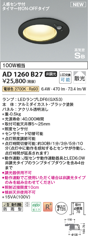 コイズミ照明 AD1260B27 ダウンライト 埋込穴φ125 非調光 LED 電球色 高気密SB形 ベース 散光 人感センサ付 タイマー付ON/OFFタイプ 防雨型 ブラック