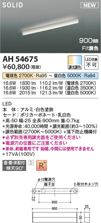 コイズミ照明 AH54675 ベースライト Fit調色 調光器別売 LED一体型 直付・壁付・床取付 単体・終端専用 900mmタイプ 白色