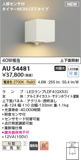 コイズミ照明 AU54481 ブラケット 非調光 LED 電球色 上下面照射 人感センサ付 タイマー付ON/OFFタイプ 防雨型 サテンホワイト