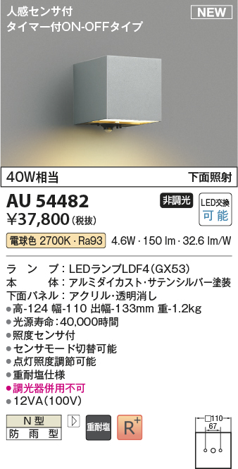 コイズミ照明 AU54482 ブラケット 非調光 LED 電球色 下方照射 人感センサ付 タイマー付ON/OFFタイプ 防雨型 サテンシルバー
